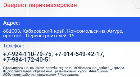 Эверест, парикмахерская по адресу 681003, Хабаровский край, Комсомольск-на-Амуре, проспект Первостроителей, 15 в дальнейшем Организация, размещена в следующих категориях: