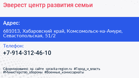 Эверест, центр развития семьи по адресу 681013, Хабаровский край, Комсомольск-на-Амуре, Севастопольская, 51/2 в дальнейшем Организация, размещена в следующих категориях: