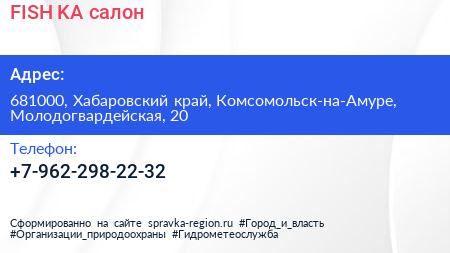 FISH-KA, салон по адресу 681000, Хабаровский край, Комсомольск-на-Амуре, Молодогвардейская, 20 в дальнейшем Организация, размещена в следующих категориях: