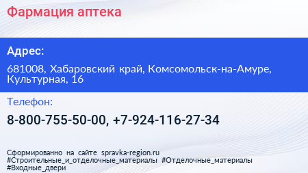Фармация, аптека по адресу 681008, Хабаровский край, Комсомольск-на-Амуре, Культурная, 16 в дальнейшем Организация, размещена в следующих категориях: