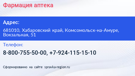 Фармация, аптека по адресу 681010, Хабаровский край, Комсомольск-на-Амуре, Вокзальная, 51 в дальнейшем Организация, размещена в следующих категориях:
