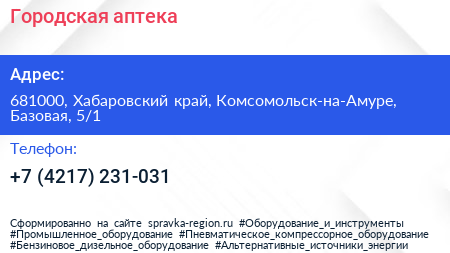 Городская аптека по адресу 681000, Хабаровский край, Комсомольск-на-Амуре, Базовая, 5/1 в дальнейшем Организация, размещена в следующих категориях: