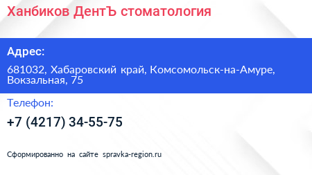 Ханбиков ДентЪ, стоматология по адресу 681032, Хабаровский край, Комсомольск-на-Амуре, Вокзальная, 75 в дальнейшем Организация, размещена в следующих категориях: