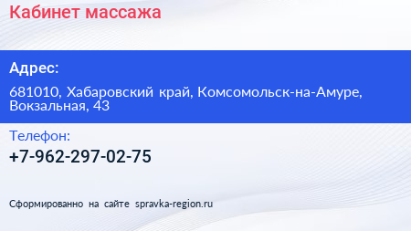 Кабинет массажа по адресу 681010, Хабаровский край, Комсомольск-на-Амуре, Вокзальная, 43 в дальнейшем Организация, размещена в следующих категориях: