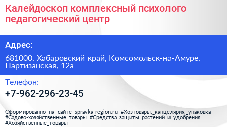 Калейдоскоп, комплексный психолого-педагогический центр по адресу 681000, Хабаровский край, Комсомольск-на-Амуре, Партизанская, 12а в дальнейшем Организация, размещена в следующих категориях: