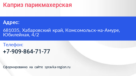 Каприз, парикмахерская по адресу 681035, Хабаровский край, Комсомольск-на-Амуре, Юбилейная, 4/2 в дальнейшем Организация, размещена в следующих категориях:
