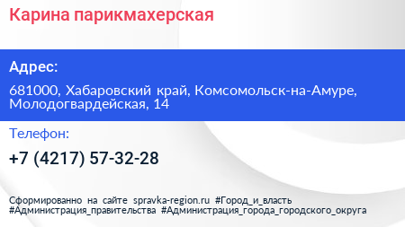 Карина, парикмахерская по адресу 681000, Хабаровский край, Комсомольск-на-Амуре, Молодогвардейская, 14 в дальнейшем Организация, размещена в следующих категориях: