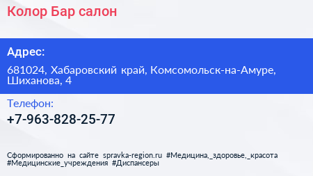 Колор Бар, салон по адресу 681024, Хабаровский край, Комсомольск-на-Амуре, Шиханова, 4 в дальнейшем Организация, размещена в следующих категориях: