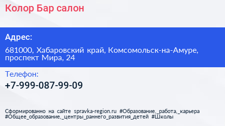 Колор Бар, салон по адресу 681000, Хабаровский край, Комсомольск-на-Амуре, проспект Мира, 24 в дальнейшем Организация, размещена в следующих категориях:
