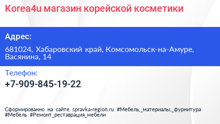 Korea4u, магазин корейской косметики по адресу 681024, Хабаровский край, Комсомольск-на-Амуре, Васянина, 14 в дальнейшем Организация, размещена в следующих категориях:
