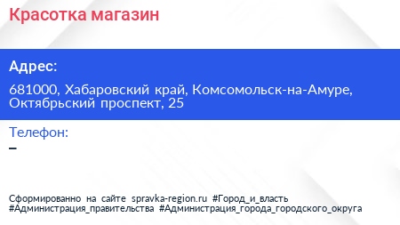 Красотка, магазин по адресу 681000, Хабаровский край, Комсомольск-на-Амуре, Октябрьский проспект, 25 в дальнейшем Организация, размещена в следующих категориях:
