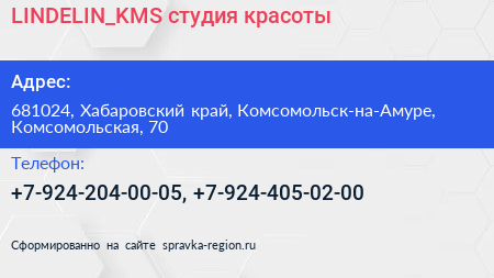 LINDELIN_KMS, студия красоты по адресу 681024, Хабаровский край, Комсомольск-на-Амуре, Комсомольская, 70 в дальнейшем Организация, размещена в следующих категориях: