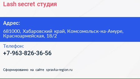 Lash secret, студия по адресу 681000, Хабаровский край, Комсомольск-на-Амуре, Красноармейская, 18/2 в дальнейшем Организация, размещена в следующих категориях: