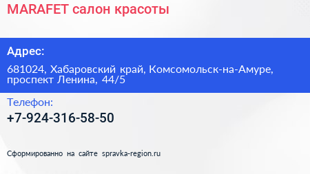 MARAFET, салон красоты по адресу 681024, Хабаровский край, Комсомольск-на-Амуре, проспект Ленина, 44/5 в дальнейшем Организация, размещена в следующих категориях: