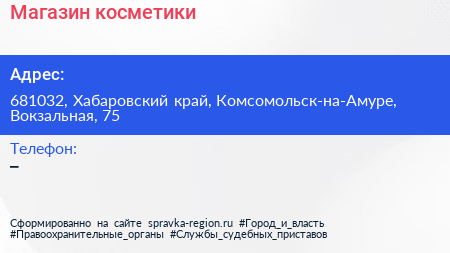 Магазин косметики по адресу 681032, Хабаровский край, Комсомольск-на-Амуре, Вокзальная, 75 в дальнейшем Организация, размещена в следующих категориях: