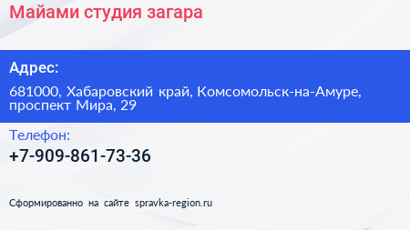 Майами, студия загара по адресу 681000, Хабаровский край, Комсомольск-на-Амуре, проспект Мира, 29 в дальнейшем Организация, размещена в следующих категориях: