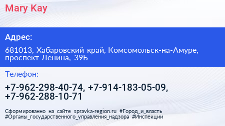 Mary Kay по адресу 681013, Хабаровский край, Комсомольск-на-Амуре, проспект Ленина, 39Б в дальнейшем Организация, размещена в следующих категориях: