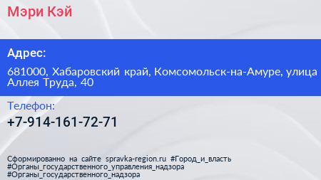 Мэри Кэй по адресу 681000, Хабаровский край, Комсомольск-на-Амуре, улица Аллея Труда, 40 в дальнейшем Организация, размещена в следующих категориях: