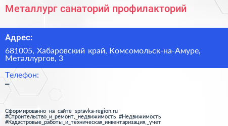 Металлург, санаторий-профилакторий по адресу 681005, Хабаровский край, Комсомольск-на-Амуре, Металлургов, 3 в дальнейшем Организация, размещена в следующих категориях: