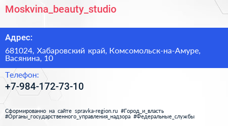 Moskvina_beauty_studio по адресу 681024, Хабаровский край, Комсомольск-на-Амуре, Васянина, 10 в дальнейшем Организация, размещена в следующих категориях: