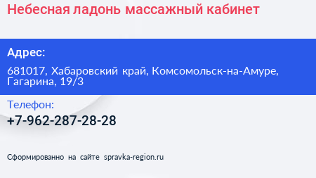 Небесная ладонь, массажный кабинет по адресу 681017, Хабаровский край, Комсомольск-на-Амуре, Гагарина, 19/3 в дальнейшем Организация, размещена в следующих категориях: