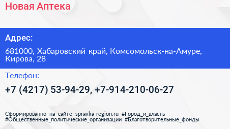 Новая Аптека по адресу 681000, Хабаровский край, Комсомольск-на-Амуре, Кирова, 28 в дальнейшем Организация, размещена в следующих категориях: