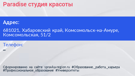 Paradise, студия красоты по адресу 681021, Хабаровский край, Комсомольск-на-Амуре, Комсомольская, 51/2 в дальнейшем Организация, размещена в следующих категориях: