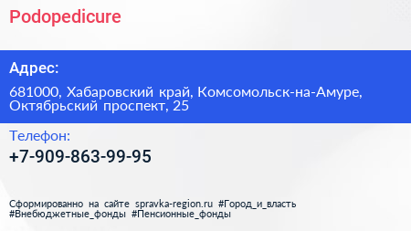 Podopedicure по адресу 681000, Хабаровский край, Комсомольск-на-Амуре, Октябрьский проспект, 25 в дальнейшем Организация, размещена в следующих категориях: