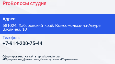 ProВолосы, студия по адресу 681024, Хабаровский край, Комсомольск-на-Амуре, Васянина, 10 в дальнейшем Организация, размещена в следующих категориях: