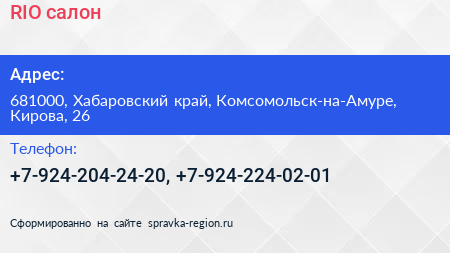 RIO, салон по адресу 681000, Хабаровский край, Комсомольск-на-Амуре, Кирова, 26 в дальнейшем Организация, размещена в следующих категориях: