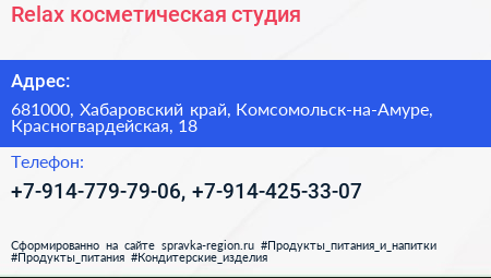Relax, косметическая студия по адресу 681000, Хабаровский край, Комсомольск-на-Амуре, Красногвардейская, 18 в дальнейшем Организация, размещена в следующих категориях: