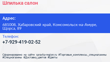 Шпилька, салон по адресу 681008, Хабаровский край, Комсомольск-на-Амуре, Щорса, 89 в дальнейшем Организация, размещена в следующих категориях: