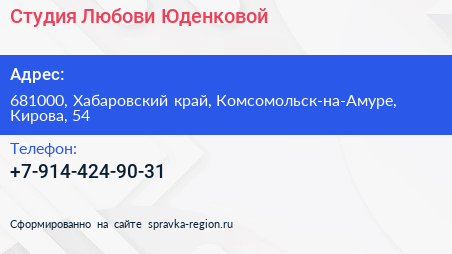 Студия Любови Юденковой по адресу 681000, Хабаровский край, Комсомольск-на-Амуре, Кирова, 54 в дальнейшем Организация, размещена в следующих категориях: