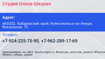 Студия Олеси Шкаран по адресу 681032, Хабаровский край, Комсомольск-на-Амуре, Вокзальная, 75 в дальнейшем Организация, размещена в следующих категориях: