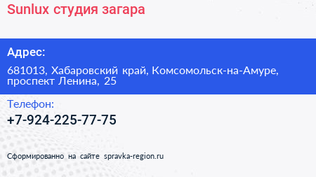 Sunlux, студия загара по адресу 681013, Хабаровский край, Комсомольск-на-Амуре, проспект Ленина, 25 в дальнейшем Организация, размещена в следующих категориях: