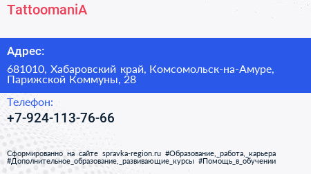 TattoomaniA по адресу 681010, Хабаровский край, Комсомольск-на-Амуре, Парижской Коммуны, 28 в дальнейшем Организация, размещена в следующих категориях: