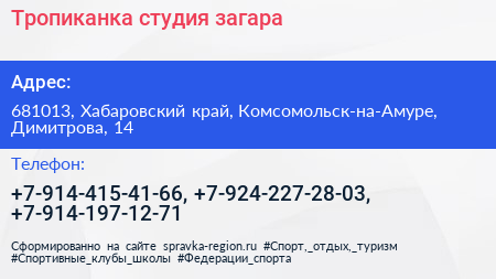 Тропиканка, студия загара по адресу 681013, Хабаровский край, Комсомольск-на-Амуре, Димитрова, 14 в дальнейшем Организация, размещена в следующих категориях: