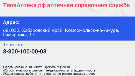 ТвояАптека.рф, аптечная справочная служба по адресу 681032, Хабаровский край, Комсомольск-на-Амуре, Гамарника, 17 в дальнейшем Организация, размещена в следующих категориях: