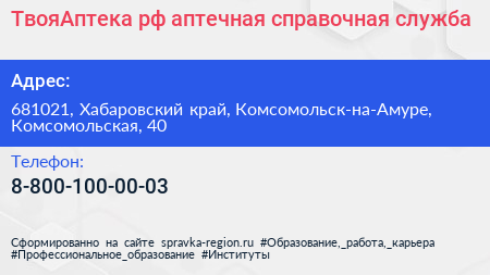ТвояАптека.рф, аптечная справочная служба по адресу 681021, Хабаровский край, Комсомольск-на-Амуре, Комсомольская, 40 в дальнейшем Организация, размещена в следующих категориях: