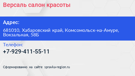 Версаль, салон красоты по адресу 681010, Хабаровский край, Комсомольск-на-Амуре, Вокзальная, 58Б в дальнейшем Организация, размещена в следующих категориях: