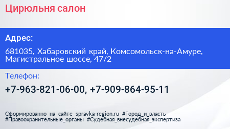 Цирюльня, салон по адресу 681035, Хабаровский край, Комсомольск-на-Амуре, Магистральное шоссе, 47/2 в дальнейшем Организация, размещена в следующих категориях: