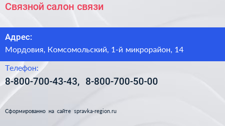 Связной, салон связи по адресу Мордовия, Комсомольский, 1-й микрорайон, 14 в дальнейшем Организация, размещена в следующих категориях: