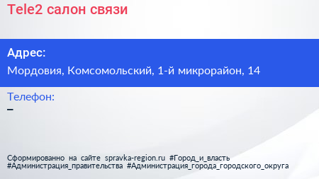 Tele2, салон связи по адресу Мордовия, Комсомольский, 1-й микрорайон, 14 в дальнейшем Организация, размещена в следующих категориях: