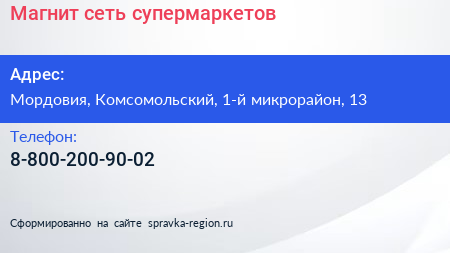 Магнит, сеть супермаркетов по адресу Мордовия, Комсомольский, 1-й микрорайон, 13 в дальнейшем Организация, размещена в следующих категориях: