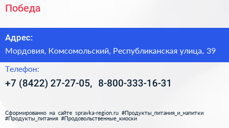 Победа по адресу Мордовия, Комсомольский, Республиканская улица, 39 в дальнейшем Организация, размещена в следующих категориях: