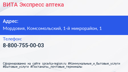ВИТА Экспресс, аптека по адресу Мордовия, Комсомольский, 1-й микрорайон, 1 в дальнейшем Организация, размещена в следующих категориях: