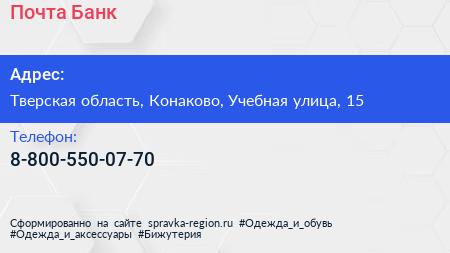 Почта Банк по адресу Тверская область, Конаково, Учебная улица, 15 в дальнейшем Организация, размещена в следующих категориях: