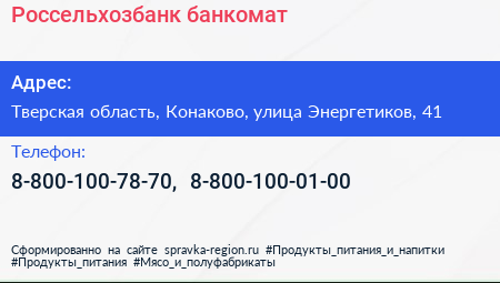 Россельхозбанк, банкомат по адресу Тверская область, Конаково, улица Энергетиков, 41 в дальнейшем Организация, размещена в следующих категориях: