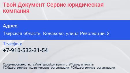 Твой Документ Сервис, юридическая компания по адресу Тверская область, Конаково, улица Революции, 2 в дальнейшем Организация, размещена в следующих категориях: