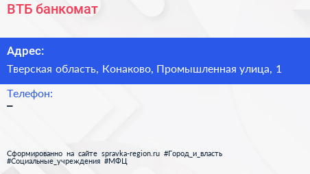 ВТБ, банкомат по адресу Тверская область, Конаково, Промышленная улица, 1 в дальнейшем Организация, размещена в следующих категориях: